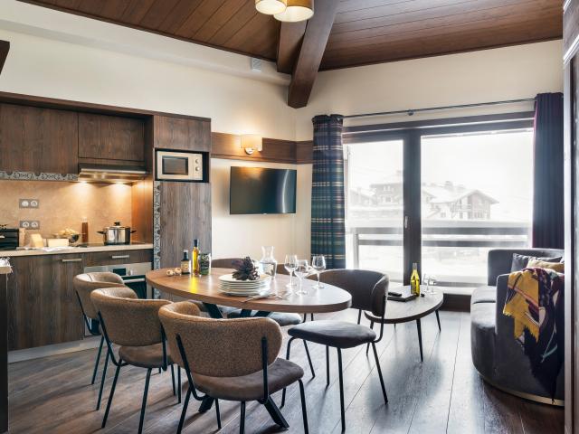 Treromsleilighet, ett soverom med dobbeltseng og ett med to enkeltsenger, stue, kjøkkenkrok, to bad/dusj og WC samt balkong med utsikt over dalen eller fjellene.